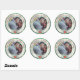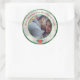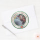 This elegant Christmas photo sticker label features a sample photograph in the centre which you can replace with a picture of your own family or other custom image. A sample Christmas greeting and family name are printed at the top. A circular frame features a faux green glitter border and bokeh style centre. A festive red poinsettia is placed at the bottom.