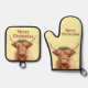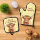 Merry Christmas Greenery Highland Miniature Cow Oven Mitt & Pot Holder Set