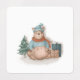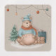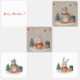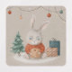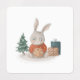 Merry Christmas and happy new year greeting card with cute bunny on a cosy carpet with presents and holiday tree
