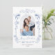 Elegant holiday card featuring your photo in an arch within a dusty blue hand-drawn frame adorned with seasonal bells, bows, and poinsettia florals, "Merry Christmas" in a stylish dusty blue script, and your family name and the year in classic serif typography.