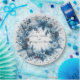 On a sparkly white Christmas background, sits this pretty shades of blue wreath with centre text "Merry Christmas and Happy New Year"