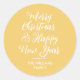 A modern Merry Christmas Happy New Year sticker or envelope seal with white elegant script calligraphy and simple stylish typography on a pumpkin yellow background. Exclusively designed for you by Happy Dolphin Studio!