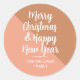 A modern Merry Christmas Happy New Year sticker or envelope seal with white elegant script calligraphy and simple stylish typography on a burnt orange and pink background. Exclusively designed for you by Happy Dolphin Studio!