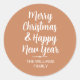 A modern, burnt orange Merry Christmas Happy New Year sticker or envelope seal with white elegant script calligraphy and simple stylish typography on a terracotta background. Exclusively designed for you by Happy Dolphin Studio!