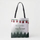 Merry Christmas, Happy New Year tote with holiday trees and decoration.