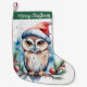 Christmas Stocking featuring a cute watercolor Owl with a Christmas hat. Customisable.