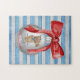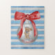 Celebrate the holidays with this gorgeous coastal-themed Christmas jigsaw puzzle. The design is a white Christmas ornament ball with a festive red bow and the cutest little nautical bear complete with sailor hat. The text reads, "Merry Christmas Hilton Head Island." The background is a coastal blue and light grey stripe pattern. The jigsaw puzzle is available in various size options. This design also available as a Christmas card. Please browse our complete collection of coastal, Lowcountry, and Hilton Head Island themed holiday cards and gifts. Special design requests accepted. (Creative design by Glenda Motsavage.)
