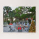 Merry Christmas from beautiful Hilton Head Island! The design on this seasonal jigsaw puzzle features a photo image of a lit fire pit in the sand, captured at an upscale ocean-side resort. The relaxing Lowcountry scene is all decked out for the holidays. The Christmas decorations include a green wreath on the gazebo, red bows on the archway, gold bells on the fence, lit garland on the walkway, a red bow on the adirondack chair, a cosy blanket, and lit Christmas tree. A large red "Merry Christmas" sign in the sand completes the festive sitting area. The puzzle is available in various size options. Please browse our complete collection of Hilton Head Island, Lowcountry, and Coastal cards, home decor, and gift items. Photography and design by Glenda Motsavage.