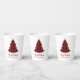 This design features a merry Christmas calligraphy script cute paper cup with a simple Christmas tree buffalo check, a stylish trendy calligraphy script text, a rustic country farmhouse minimal, minimalist festive holiday pattern, red black and white design, coffee tea cocoa hot drinks supplies, a creative simplistic chequered style, Christmas holiday fun celebration, a custom disposable party paper products