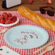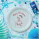 Paper plates with a whimsical and cute watercolor painting of a husky dog wearing a blue Santa hat.