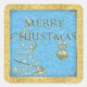 Shiny gold “Merry Christmas” on blue star covered background with golden stars, tree and ornament surrounded by a bright golden glitter frame - small square sticker