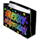 This fun Christmas gift bag design features the message "MERRY CHRISTMAS!" having letters with a rainbow spectrum gradient pattern. The background features a colourful star shapes pattern.