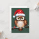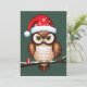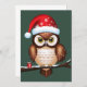This charming design features a detailed illustration of a brown and white owl perched on a branch. The owl wears a red Christmas hat sprinkled with white snowflakes, adding to the festive spirit. Its large captivating eyes draw attention, while a small red gift with a white ribbon subtly rests at the base of the branch, suggesting the generous nature of the holiday season. This design captures the warmth and joy of Christmas through the representation of this iconic winter bird in a cozy and celebratory setting.