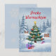 Christmas card with a festively decorated fir tree in the snowy forest. Cute animals gather around the tree, surrounded by gifts and twinkling lights. The loving, fairytale-like design is perfect for children and adults alike.