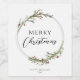 A Christmas wine label featuring a minimalist watercolor wreath with red floral and green foliage accents. This elegant wreath frames the greeting "Merry Christmas". Easy to personalise with your family name.