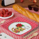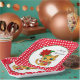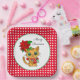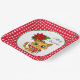 Cute orange kitten holding a Poinsettia Flower Christmas paper plates with polka dots.