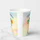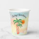 These island style paper cups feature hand drawn palm trees decorated with lights and a sun on a watercolor background.