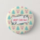 A button badge which says Merry Christmas inside a fancy whimsical handdrawn frame with a festive christmas pattern on a cream coloured background. Illustrations of pastel coloured, greenish-blue, christmas trees and pastel pink baubles and bows in a repeating pattern. Has a cool retro feel.