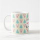 A stylish retro themed coffee mug with a whimsical handdrawn frame which says Merry Christmas in the centre. The text can be changed to say whatever you like such as a name or seasons greetings etc... The background design is a festive christmas pattern on a cream colour. Illustrations of pastel coloured, greenish-blue, christmas trees and pastel pink baubles and bows in a repeating pattern.
