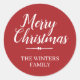 A simple and modern Merry Christmas gift sticker or envelope seal with the text Merry Christmas in white chic handwritten script calligraphy on a red background. Simply add your family name. Exclusively designed for you by Happy Dolphin Studio. If you need any help or matching products, please contact us at happydolphinstudio@outlook.com.