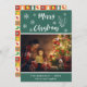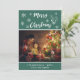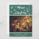 A modern Christmas photo card in green and white. Customise and add your family photo for the holiday greetings. Merry Christmas in white with snowflakes. Template for your family name on front. Green background colour.
