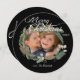 Round Christmas holiday photo card with a greenery and pine cones wreath, an area you can easily add a photo, white text that reads Merry Christmas, and an area you can add your name and current year on front. The back of the card is black with fancy white text that reads Happy Holidays with a couple snowflakes. Photography © Storytree Studios, Stanford, CA