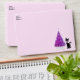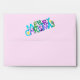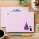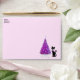 This envelope is light pink with the text Merry Christmas is colourful festive letters on back flap and a dark pink and shiny silver Christmas tree on white star rug beside a black cat with pink bow on the front. Customise your return address on the front with the template.