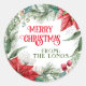 Traditional Merry Christmas Red Poinsettia Round Self-Stick Gift Label. For further customisation, please click the "customise further" link and use our design tool to modify this template.