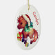 On the front of this keepsake ceramic ornament for a child is an adorable pony wearing a Santa hat and boots. He has a Holiday wreath with lights around his neck. He stands between a Christmas tree bulb and a brightly wrapped green and red gift package. The back of the ornament has a Merry Christmas message, your child's name, and your signature. Perfect for a daughter, son, granddaughter or grandson, especially one who loves horses!