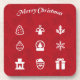 A trendy, modern and festive themed illustration. The graphic features a set of 9 christmas icons. The background is red with a faint pattern of various popular christmas symbols. On top of the red background in bold bright white are some more seasonal christmas icons including a snowflake, angel, wrapped gift, santa face, sprig of pine, a snow globe, a warm fireplace, a decorated christmas tree and an ornament. Merry Christmas is written at the top in a cheerful white font. Cute, trendy and fun.