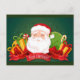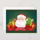 Illustration of Santa Claus with a white beard and red hat, surrounded by gifts and candy canes, with a green background and snowflakes, and a red ribbon with the words "Merry Christmas!" in a cartoon style.