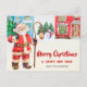 This Santa Claus theme Merry Christmas postcard featuring Santa Claus with Christmas tree and some decorated houses with snowman between them. Also card has "Merry Christmas & happy New Year" words on the front - these texts are changeable.