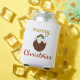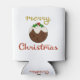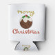 'Merry Christmas' in faux gold colour and red script with illustration of a Christmas pudding with holly centre. Design on front, back and bottom.