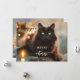 A lovely Christmas and New Year holiday card featuring a beautiful cat with a candle and sparkling lights. The back shows a fantasy landscape with Christmas trees in warm golden colours and your custom texts. Great for anyone who loves cats.
