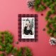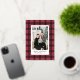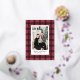 This elegant and trendy custom Merry Christmas holiday card features a portrait photo framed by a rustic chic rich claret red and black tartan plaid pattern with real gold foil accents. Personalize with your choice of holiday greeting, the modern family signature in script writing, the year, and choose to include more wording in the bonus space on the back of the card. A second optional bonus photo is also included on the back.