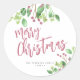 Modern stylish Merry Christmas red green handwritten typography script simple gift label round sticker with your name featuring watercolor botanical greenery and holy berries.