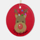 Reindeer with lights tangled in its antlers. The word Merry Christmas written at the bottom. The same image and saying are on both sides so that it can hang whichever way it turns.