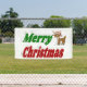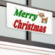 Banner with Merry Christmas in 3D green and red text and a reindeer. Available in several sizes for indoor and outdoor.
