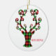 Christmas ornament in the round shape. Shown here in White with text of Merry Christmas and print of a plaid deer with antlers.