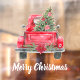 A watercolor vintage red truck carrying a decorated pine tree and the words Merry Christmas.