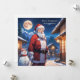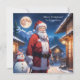 A personalised Christmas Card featuring Santa Clause and a snowman in a Christmas Village with a blanket of snow.