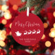 Fun seasonal red and white Christmas tree ornament featuring a silhouette of reindeers flying Santa's sleigh through air and "Merry Christmas" in a stylish modern script and your name or other text below. Add a photo on the back.