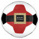 Merry Christmas message on a red custom soccer ball with a fun and festive Santa suit design, perfect for giving with or as a soccer themed Christmas gift. Edit the text or add a name using Zazzle's advanced design editor.