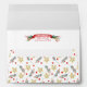 Attractive white envelope with watercolor greenery, holly and Christmas star cookies pattern on back low area as well as decorative stripe on the front. Top back flap with beautiful "Merry Christmas" phrase in red hand written Calligraphy framing your name(s) and return address information. Inside watercolor small greenery element with red banner with two text areas for message giving you the ability to really personalise this design and make it your own. Collection with coordinating products available.