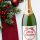 Chic, modern cursive script across a gorgeous red ribbon and bow reads MERRY CHRISTMAS in elegant cursive typography. A tied bow is super trendy for 2025 holiday party champagne bottle labels. Personalise with your family or business name in the centre.