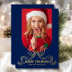 Merry Christmas Simple Modern Coquette Bow Photo Foil Holiday Card Foil Stamped Christmas Cards features a simple design with your favourite photo with the foil text overlay "Merry Christmas" in modern calligraphy script typography accented with a foil stamped bow on a blue background. Personalised your names or custom text below and your custom message on the reverse. Perfect for family and friends to celebrate Christmas and the holidays. Designed by ©2025 Evco Studio www.zazzle.com/store/evcostudio