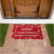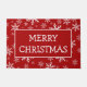 This doormat features a customizable greeting, currently reading "Merry Christmas" with a white trimmed red rectangle on a deep red background covered in various sized snowflakes. Easily change the greeting to "Season's Greetings" or any other similarly sized phrased right on the product page!