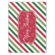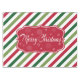 Merry Christmas illustration with text and snowflakes design on red, white and green striped background