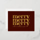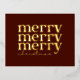 This festive postcard has the text Merry, Merry, Merry, and Christmas in gold foil. This classic and retro style card adds a beautiful and shiny custom touch to your seasonal greetings. (Background red colour may be changed per your preference -- just go into the personalisation area.)