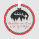 This unique double sided ornament has a black overlayed ornament of Santa and his sleigh flying above the trees in the night sky. It says "Merry Christmas to All and To All A Good Night!" It is bordered with a red and green circle and a grey centre with white holly leaves and berries. The reverse side of the ornament has a red reindeer buck leaping and it says Holly Jolly. It has a grey background with a red and green circle and the white holly leaves and berries.